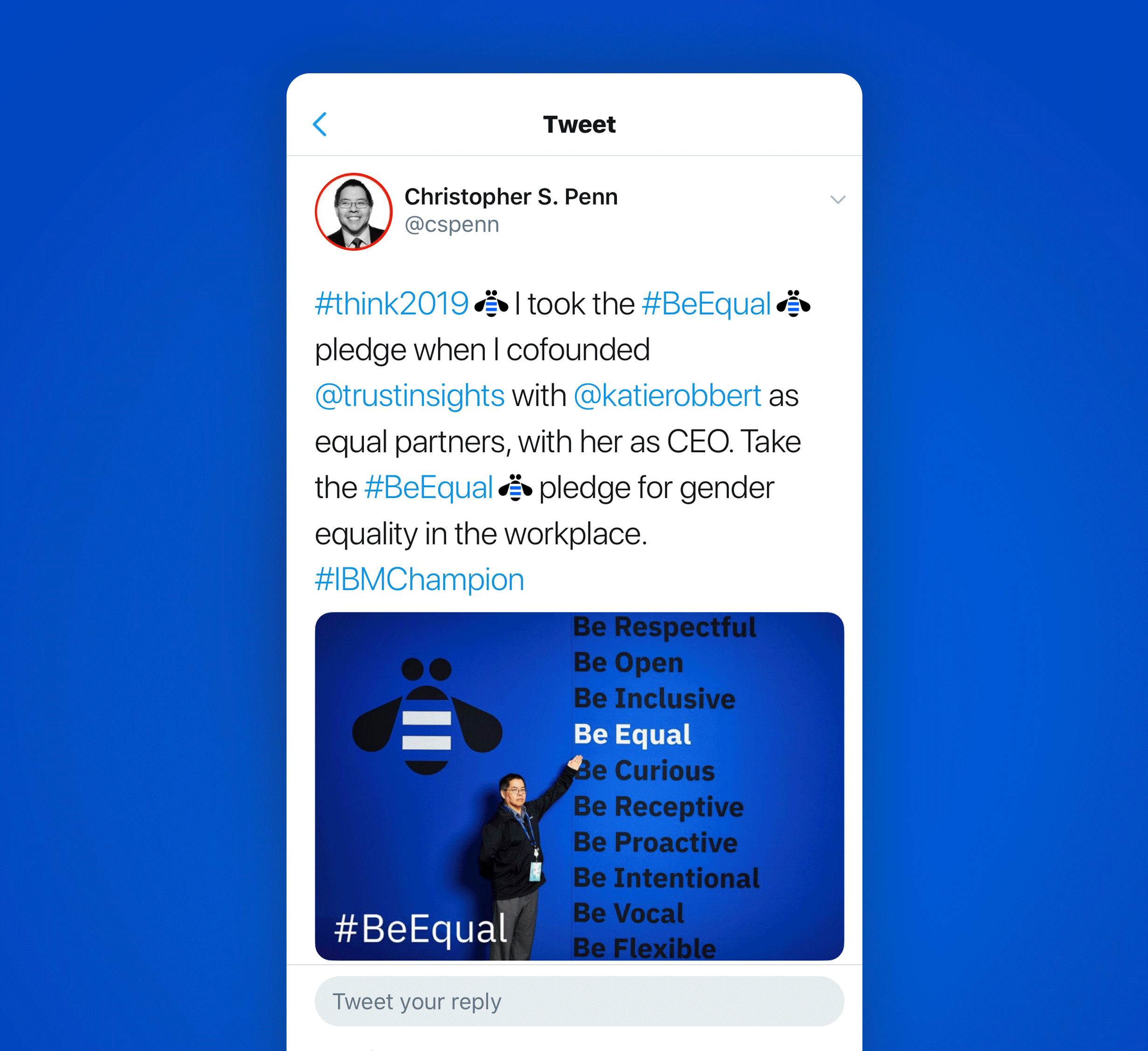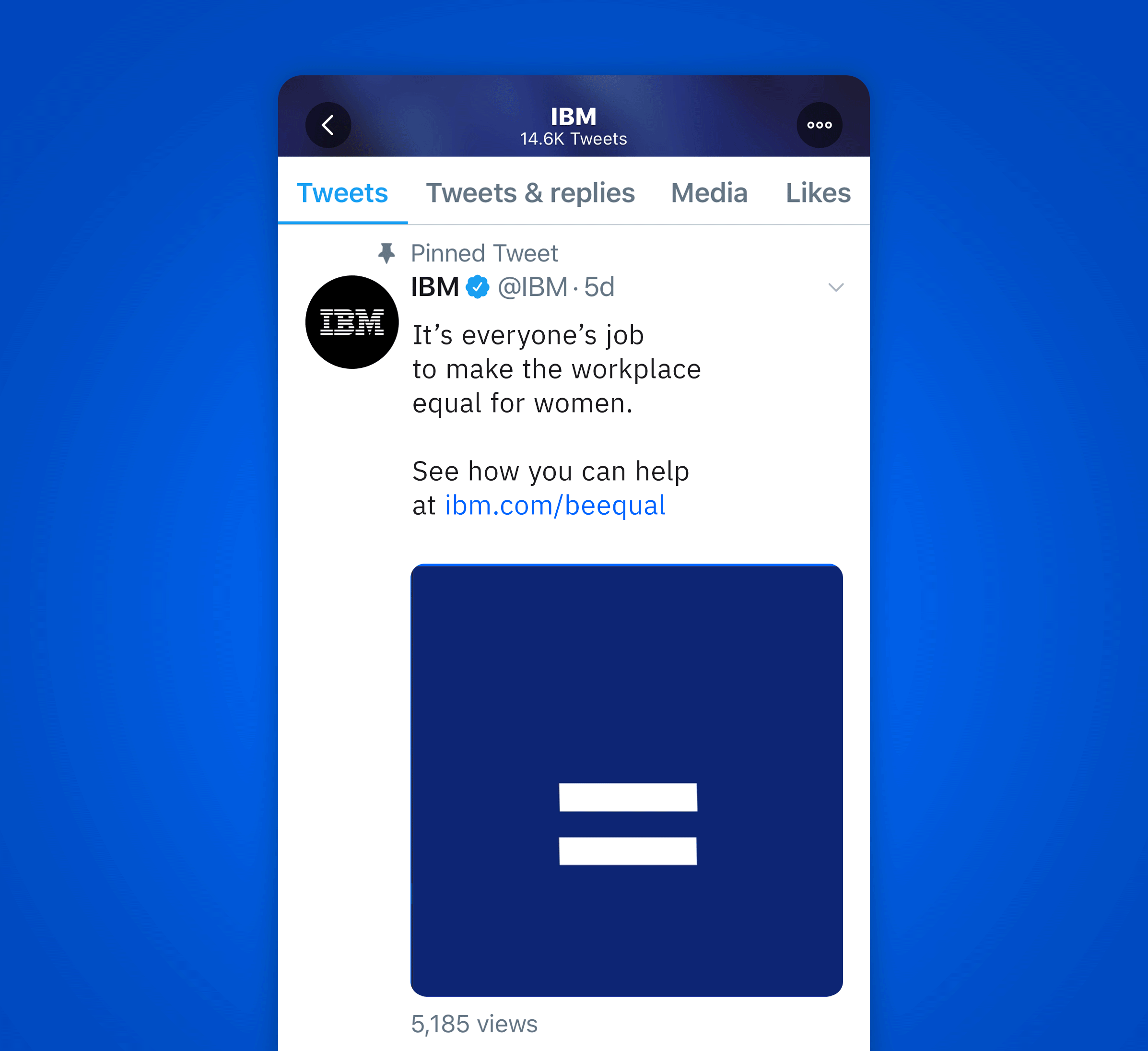 Working closely with IBM CMO Michelle Peluso, I co-lead the creation of Be Equal—a messaging and action platform with the goal of achieving equal representation of women in business leadership. Instead of putting the onus only on women to make a change, this initiative is a call to action for both men and women to do whatever is in their power to promote 50/50 representation in leadership roles.